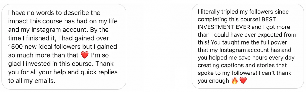 This course was the best investment I could have made in my Instagram and my business. My engagement and followers have gone through the roof and are continuously growing!”